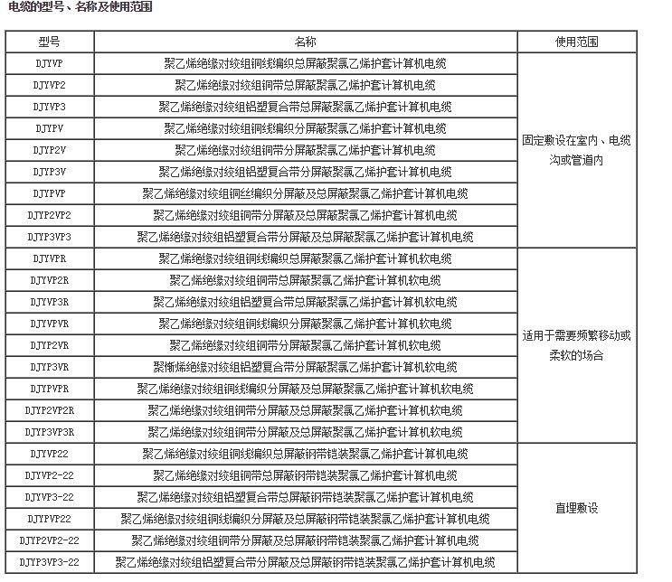 屏蔽材料有圓銅線、銅帶、鋁箔/塑料復(fù)合帶三種。屏蔽對(duì)與屏蔽對(duì)具有較好的絕緣性能,電纜在使用中若屏蔽對(duì)與屏蔽對(duì)之間出現(xiàn)電位差時(shí),不會(huì)影響信號(hào)的傳輸質(zhì)量。 計(jì)算機(jī)電纜的型號(hào)、名稱及使用范圍見(jiàn)表。